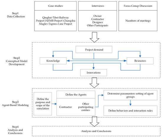 In temporary projects, how does the contractor, as the main participant, form and develop its innovation capability? Obviously, this is a dynamic process, and in order to underscore the interactions between the main players, the ABM can respond to this problem more effectively. The research design is shown in Figure 1, which includes four main steps: initial data collection, proposal of a conceptual model, construction of an ABM, analysis and conclusions. During the initial data collection stage, the research team conducted typical case studies and conducted interviews and discussions with relevant parties to clarify the contractor’s innovation process and the forms of interaction with other participants. Based on the above data analysis, the knowledge transfer model is introduced to construct a conceptual model of contractors’ innovation capability through the utilization of knowledge and resources. According to the process of ABM, modeling is conducted from the perspective of knowledge and resources, showing the interaction between contractors and participants and the development of innovation capabilities. Finally, the research results are analyzed, the direction of innovation capability improvement is discussed, and the conclusions are presented.