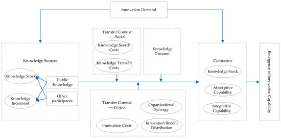 Drawing upon the concept of innovation capability, this study develops a conceptual model for the emergence of contractor innovation capability in response to the characteristics of demand-oriented construction project innovation. To integrate existing research, the knowledge transfer framework introduced by Easterby-Smith and Lyles is referenced [29]. The finalized conceptual model is illustrated in Figure 2.
