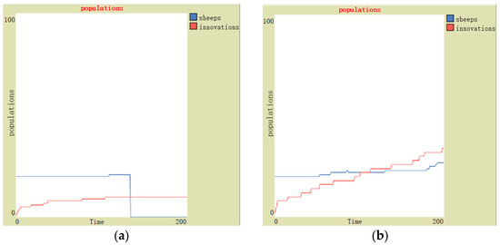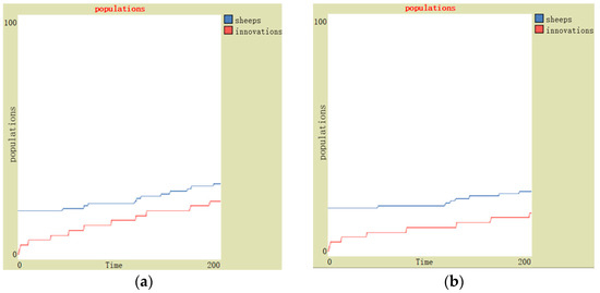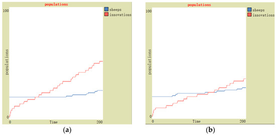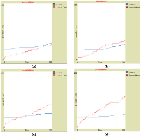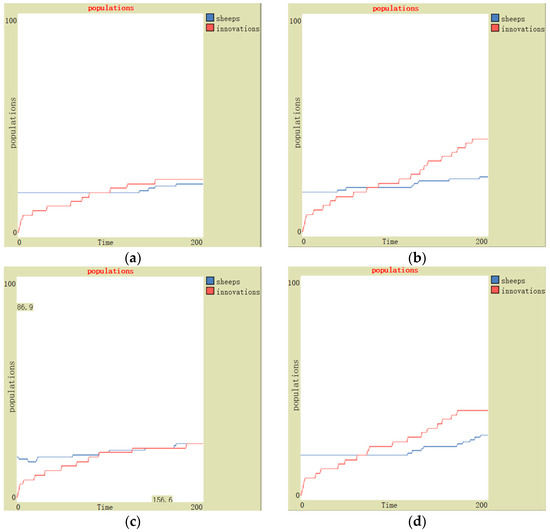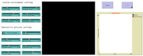 The Setup command is utilized to establish or reset the simulation environment. The Go command executes the simulation model and captures system output. Manipulate the slider to create various combinations of parameters, thereby simulating diverse scenarios of construction project innovation. After iterating the model 200 times, the output of the model corresponds to the count of sheep, and innovative achievements.