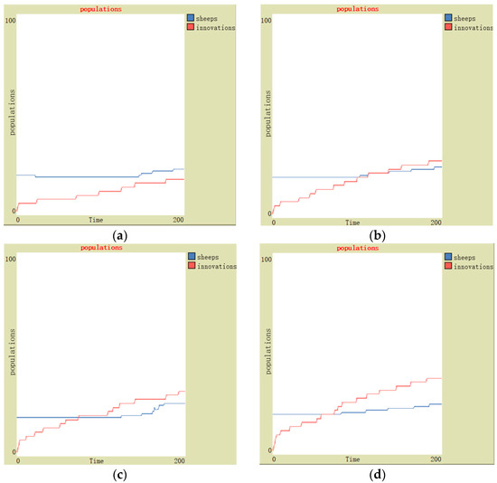 Existing literature has delved into the relationship between absorptive capability and integration capability [62]. Nevertheless, there is limited discourse on how these two factors, when combined differently, impact innovation capability in diverse settings. Compared to the Figure 7b,c and Figure 8b,c, the growth rate of innovation achievements is evidently slower when absorption capability is high and integration capability is low, particularly during the early stage. When overall capability is limited, contractors struggle to quickly apply acquired knowledge to solve practical engineering problems, leading to a greater need to access external knowledge. Although enhancing knowledge absorption capability enables contractors to acquire additional knowledge from public sources and other innovation participants to support innovation, the cost of knowledge transfer in such an environment is clearly higher. This increases the cost challenges facing contractors in relation to innovation, casting doubt on its sustainability.