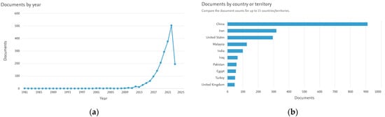 Results of the search in the Scopus database: (a) published documents by year; (b) published documents by country [19].