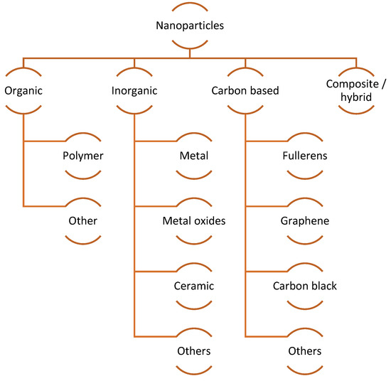 Today, among these forms, the nanoparticles seem to be the most widely and most universal. They find applications in various matrices and are used for different purposes. The most popular functions for nanoparticles are connected with influencing the antibacterial properties, mechanical properties, conductivity and thermal properties, magnetic properties, and processing properties, among others [2,25]. Also, they may be manufactured from many materials, which significantly influences the composite’s properties and area of application [26,27]. In the literature, there are a lot of classifications for nano-materials: one of the most frequently applied is presented in Figure 2.
