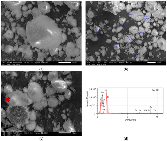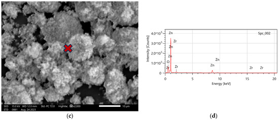 The morphology of nano zinc oxide: (a) SEM image of nano zinc oxide at 950× magnification; (b) SEM picture with measured and marked selected particle dimensions; (c) SEM picture with marked point for EDS analysis; (d) Results of EDS analysis for nano zinc oxide.