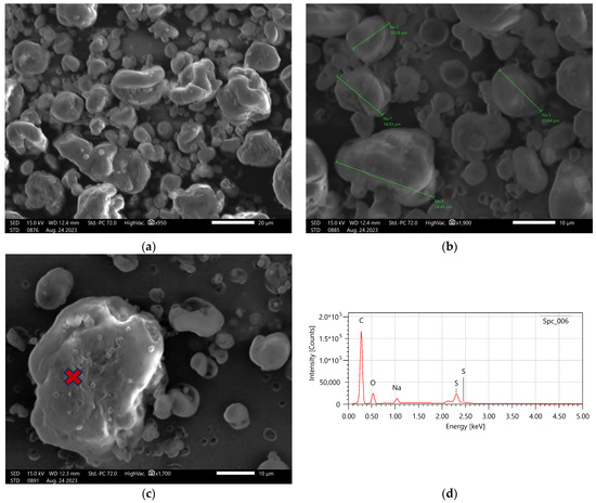 These particles had a regular shape that is close to spherical with a particle dimension of about 15 μm (Figure 8). Additionally, EDS analysis was provided for the selected point (Figure 8 and Table 4).