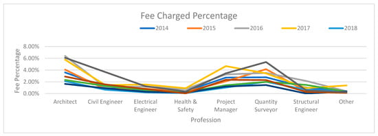 Fee charged percentage across professionals in the built environment. (NB: Color signifies the years from 2014–2018).