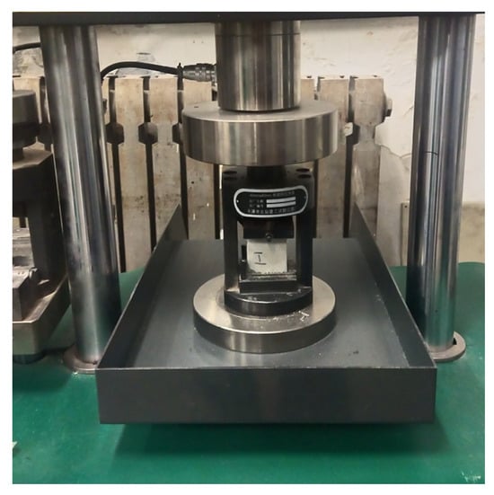 For specimen pre-cracks, specimens cured in water for 3 days were positioned within YAW-300D microcomputer-controlled cement compression and flexure testing apparatus. Figure 1 shows schematic diagram. In order to pre-crack the specimen with a width of 100–300 μm, a steel wire of approximately 1 mm diameter and 50 mm length is placed at bottom of specimen. A load was applied to the specimen, the loading rate was set to 0.5 KN/s, and the loading force value was set to 33 KN–43 KN until the target crack width was obtained. Figure 2a shows a schematic diagram of pre-cracks apparatus for mortar specimens, and Figure 2b demonstrates pre-cracked mortar specimens.