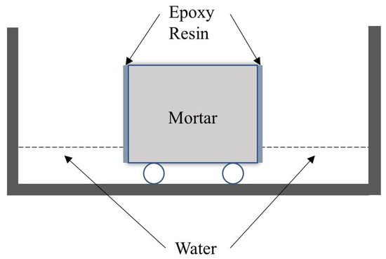 According to the ASTM C1585-20 [40] standard, water absorption tests were conducted on mortar specimens with a healing age of 28 days. Initially, the specimens were placed in an oven at a temperature of 50 ± 2 °C. Subsequently, epoxy resin was used to seal all four surfaces of each specimen (excluding the fracture surface and its counterpart). The fracture surfaces of each specimen were immersed in water by 5 mm. Finally, mass measurements were taken at predetermined time intervals (1, 5, 10, 20, 30, 60, 120, 180, 240, 300, and 360 min) using a precision electronic balance. Instrumentation used for water absorption measurements is illustrated in Figure 4. The water absorption height was quantified according to Formula (3):
