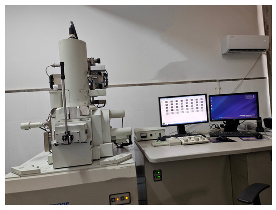 The healing filler in the crack was removed by blade scraping, followed by drying at 40 °C in an oven for 24 h. The morphology of the filler at the crack was observed using a scanning electron microscope (SEM). Elemental analysis of the filler was conducted using energy dispersive spectroscopy (EDS). The testing equipment is illustrated in Figure 5. The imaging principle involves primary electrons generating low-energy secondary electrons, and high atomic number (Z) contrast images are produced through backscattering of primary electrons.