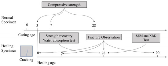 In this experiment, the compressive strength of the specimens was tested at 28 days of curing, and then compressive strength recovery of the pre-cracked specimens was tested after healing at 28 days of age. The compressive strength recovery rate () was calculated as indicated in Equation (2) [39]: