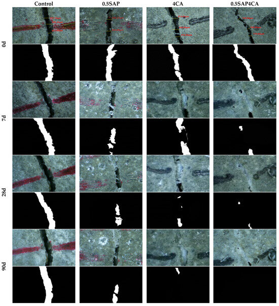 The crack observation images of specimens are shown in Figure 8. The figure indicates that Control specimens had minimal impact on crack healing after 90 days. By contrast, the 0.5SAP, 4CA, and 0.5SAP4CA specimens exhibited pronounced healing effect compared to Control specimens.