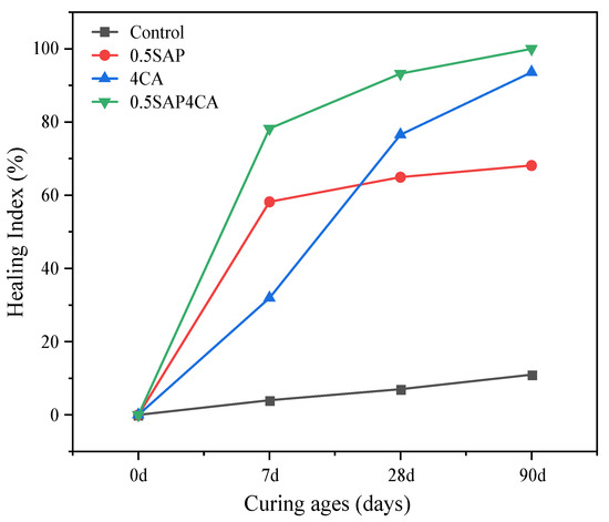 Crack healing index of specimens at 0, 7, 28, and 90 days of healing age.