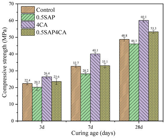 The compressive strength of mortar at 3, 7, and 28 days is shown in Figure 10. The experimental results indicate that, with the extension of the curing age, the compressive strength of mortar specimens in each group gradually increases, primarily due to the continuous hydration of cement. At curing ages of 3, 7, and 28 days, the compressive strength of the control group specimens is 22.4 MPa, 32.7 MPa, and 48.8 MPa, respectively. In comparison to the control group, the compressive strength of mortar with 0.5 wt.% SAP (0.5SAP specimen) at 3, 7, and 28 days is 20.2 MPa, 28.2 MPa, and 46.1 MPa, respectively, representing a decrease of 9.8%, 13.8%, and 5.5%, respectively. It is evident that the addition of the SAP reduces the compressive strength at all curing ages. The negative impact on compressive strength is attributed to the water absorption and expansion of the SAP, creating larger voids in the mortar. Lee et al. [26] reported that the voids formed by the initial irregularities of the SAP are classified as large pores (diameter greater than 50 nm). Specimens with 4 wt.% CA (4CA specimen) exhibit compressive strengths of 26.4 MPa, 40.1 MPa, and 60.1 MPa at curing ages of 3, 7, and 28 days, respectively. At the 28-day curing age, the compressive strength increases by 23.2%, with increases of 17.9% and 22.6% at 3 and 7 days, respectively. This is attributed to the reactive substances in the CA reacting with the cement hydration product Ca(OH)2, generating dense hydrated calcium silicate to fill the pores in the mortar, ultimately leading to a continuous increase in compressive strength. The compressive strength of the 0.5SAP4CA specimen at 3, 7, and 28 days is 23.6 MPa, 33.1 MPa, and 53.3 MPa, respectively, which is similar to the compressive strength of the control group specimens. This is because the addition of the SAP increases the number of large pores, negatively affecting the compressive strength. However, the CA has a positive effect on compressive strength. In summary, the compressive strength of the 0.5SAP4CA specimen is similar to that of the control group due to the combined action of the CA and the SAP.