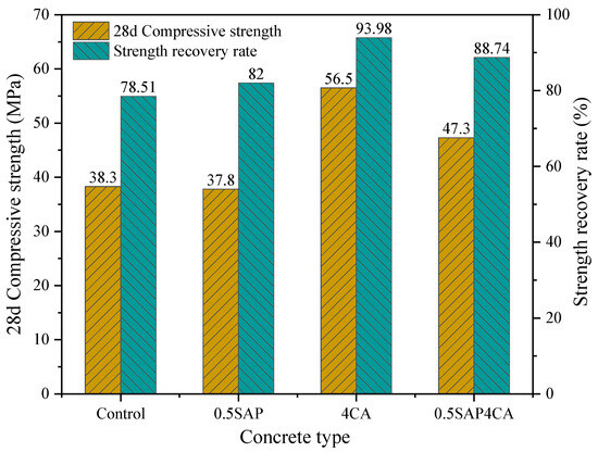 Compressive strength and strength recovery rate of mortar at 28 d.