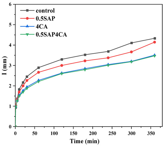 Water absorption can be used to evaluate the healing ability of cracks in cement mortar specimens [43]. To study the healing ability of the specimens, the 28 days water absorption rate of specimens was tested in this study, and the measured water absorption rates were shown in Figure 12. The experimental results showed that the water absorption heights of 0.5SAP, 4CA, and 0.5SAP4CA specimens were smaller than that of the Control specimens, which indicated that the water absorption rate of all three groups was lower than that of the Control specimens. The water absorption rate of 0.5SAP specimens was lower than that of Control specimens, on the one hand, because the addition of the SAP in the specimens increased the porosity inside the specimens leading to the increase of water absorption rate of the specimens. On the other hand, it was due to the formation of the insoluble gel after the water absorption and swelling of the SAP, and this gel filled the cracks, leading to the decrease of water absorption rate of the specimens. In this study, due to crack healing in the specimens being more pronounced than the effect of reducing water absorption due to the porosity change of the concrete [44], the 0.5SAP specimens showed a decrease in water absorption, with 58.2% at 28 d healing age. And the water absorption of the 4CA and 0.5SAP4CA specimens was lower than the 0.5SAP specimens due to the better healing effect. As shown in Figure 9, the healing index of 4CA and 0.5SAP4CA specimens at 28 d healing age were 76.5% and 93.2%, respectively. Although the 4CA and 0.5SAP4CA specimens had a significant difference in healing index, the water absorption rate of the two specimens was similar. This is mainly because the water absorption rate of the specimens is affected by the healing effect of the cracks in the specimens but also by the specimen’s pores. Active substances in the CA react with cement hydration products to produce hydrated calcium silicate to fill the cracks. At the same time, the water absorption and expansion of the SAP cause an increase in concrete porosity. Therefore, when the SAP was introduced into the cement matrix with the CA (0.5SAP4CA specimens), it had a positive effect on the self-healing of the specimens because of the combined effect of early physical filling and internal curing of the SAP and the activation reaction of the CA (η0.5SAP4CA = 93.2%). In addition, due to the increase of the specimen porosity caused by the water absorption and swelling of SAP, the 0.5SAP4CA and 4CA specimens eventually showed similar water absorption rates.
