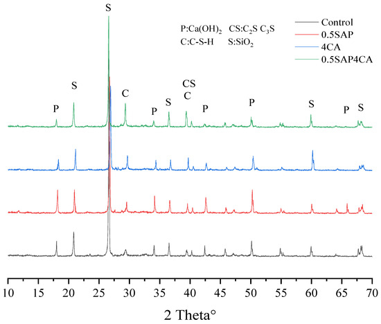 The characteristic peaks of the fillers in all sample cracking areas were analyzed using XRD. The XRD spectra of each group of samples at a healing age of 28 days are shown in Figure 14. Characteristic peaks of Ca(OH)2 can be observed at 2θ values of 18.00°, 34.10°, 42.63°, and 50.81°. Characteristic peaks of C-S-H can be observed at 2θ values of 29.71° and 39.53° [53,54]. Compared to the control group, the characteristic peaks of Ca(OH)2 in the 0.5SAP samples are higher. This is because the SAP gradually releases absorbed moisture during the cement hydration process, promoting the hydration reaction of cement and generating more Ca(OH)2. SEM analysis further revealed an increased quantity of Ca(OH)2 crystals. In contrast, the intensity of the characteristic peaks of Ca(OH)2 in the 4CA samples is lower compared to the control group. This is because the introduction of the CA increases more reactive silicon materials to consume calcium hydroxide, ultimately reducing the quantity of Ca(OH)2. Additionally, it was observed that the production of C-S-H in the 4CA samples enhanced the intensity of its characteristic diffraction peaks at 2θ values of 29.71° and 39.53°. After adding the SAP, the characteristic peaks of C-S-H in the 0.5SAP4CA samples are significantly enhanced. This is mainly because the water released by the SAP promotes the hydration of cement, subsequently generating more Ca(OH)2, providing additional reactants for the CA reaction. Furthermore, it was found that the water released by the SAP enhances the activation of the CA, and SEM testing confirms that the water released by the SAP promotes the generation of more C-S-H. These findings are consistent with the observations of Oliveira [55] and Zhang [56] et al.