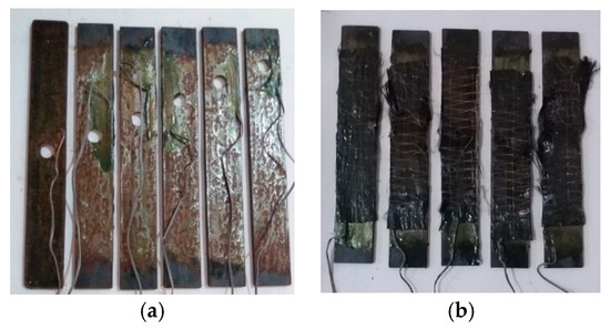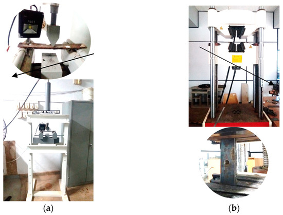 The surfaces to be strengthened were prepared using sand blasting, and the wet layup method was followed in the strengthening process. The prepared samples were kept curing for 7 days before conditioning (Figure 1). A fatigue load was applied with a 2 kN amplitude and a frequency of 5 Hz within a predefined duration according to ASTM D-790 guidance [18]. After conditioning with a predetermined number of load cycles (Figure 2a), the sample was removed from the fatigue testing machine and fixed to the universal tensile testing machine (UTM) with a 100 kN capacity to apply tensile load, as shown in Figure 2b. This procedure was repeated, and the average value of the tensile load was measured for each specimen. The strain variation at the CSH of the specimen during exposure to fatigue load was recorded using a data logger.