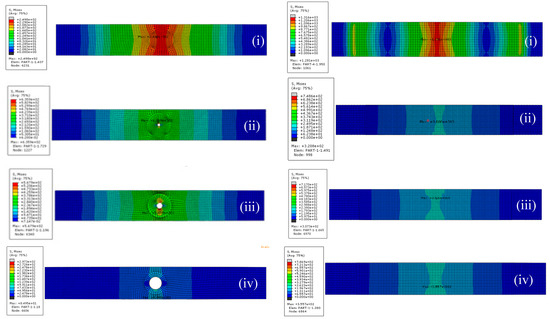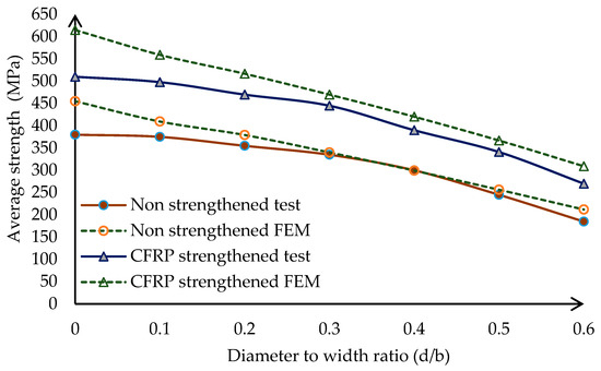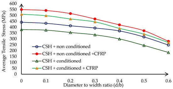 The effect of the diameter-to-width ratio of the CSH was taken into consideration as a primary variable in this analysis. The predicted results for non-strengthened and CSH/CFRP hybrids (after fatigue exposure) were compared with relevant laboratory test results, as shown in Figure 11. Contours of stress variation with offset distance for non-strengthened and CSH/CFRP hybrid systems are shown in Figure 12a,b, respectively. According to the graphs, the model results and experimental results were reasonable for the selected range of the diameter-to-width ratio of the CSH. On the other hand, the strain variation due to the diameter-to-width ratio of CFRP-strengthened CSH test results agreed well with the FEM results, as shown in Figure 11.