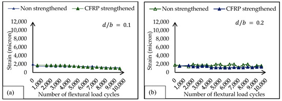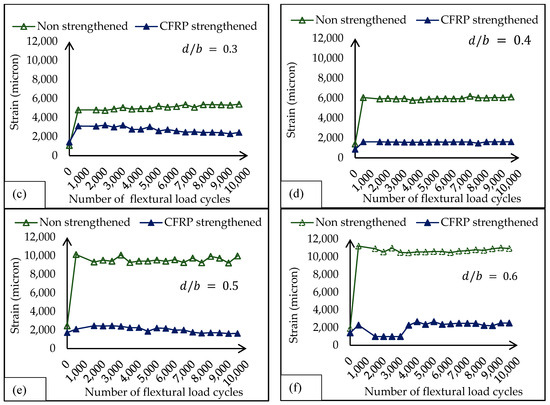 According to Figure 5a,b, no significant deviation was noted in strengthened and non-strengthened samples. The contribution of the CFRP material is negligible, and the steel substrate can withstand the effects of fatigue. When the d/b ratio increases from 0.3 to 0.6, the strain variation on the steel substrate of samples with CFRP indicates a significant strain reduction compared to the non-strengthened CSH, as shown in Figure 5c–f. This is due to the effective load-sharing ability of the attached CFRP layer. The results in strain control contribution, further delaying crack propagation in the CSH. Hence, measured strain variation indicates the effectiveness of the proposed hybrid repair technique for steel members exposed to fatigue over the traditional CSH technique.