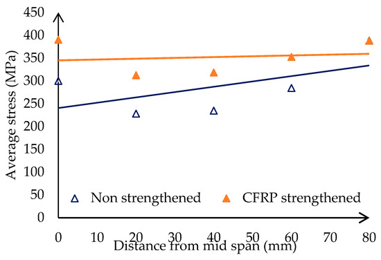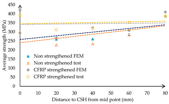 A total of 36 steel specimens with a change in position of the CSH were conditioned up to 10,000 load cycles with a 2 kN amplitude and 5 Hz frequency. Eighteen of them were reinforced with a 200 mm long CFRP layer. The remaining samples were non-strengthened and taken into consideration as controlled specimens. In these two test series, the distance from the loading point to the CSH was considered the main variable, and a CSH of a 16 mm diameter was placed at the pre-determined locations of the member. The distance to the CSH from the midspan varies from 20 mm to 100 mm in 20 mm steps. At the end of fatigue loading, the average tensile strength of the samples was determined using a universal tensile testing apparatus, and the results are plotted in Figure 6.