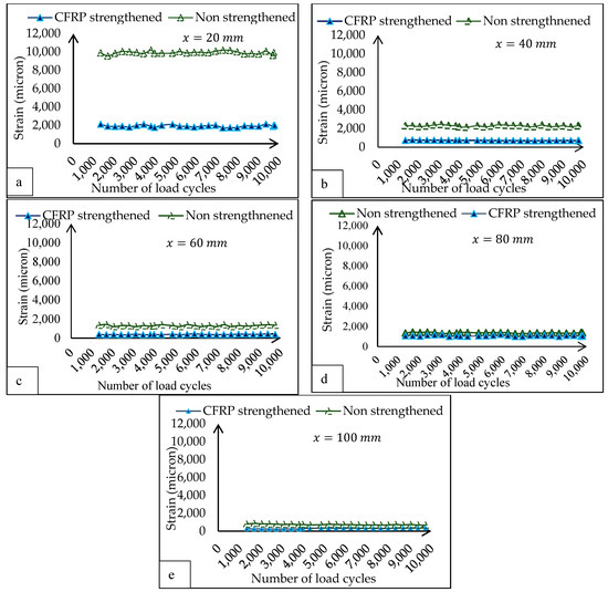 Strain gauges were fixed near the specimens, as shown in Figure 7. The average strain variation during fatigue was measured at the end of each pre-determined load cycle, as shown in Figure 8, based on the distance to the CSH from the mid-point. When the CSH is near the midspan, it is subjected to heavy stresses, which dissipate through the CFRP sheet. As a result, there is a comparatively lower strain in the steel substrate of the hybrid arrangement when compared with the conventional CSH arrangement. When the position of the CSH moves from the centre to the support, the fatigue stress also reduces. Hence, similar strain variations were observed in both strengthened and non-strengthened samples. This clearly indicates that the proposed CSH/CFRP hybrid arrangement could successfully accommodate the strain near the CSH.