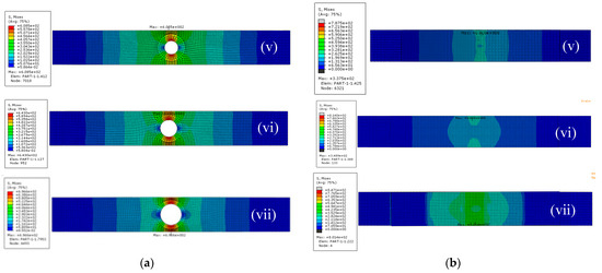 Contours of stress variation with diameter-to-width ratio for (a) non-strengthened, (b) CSH/CFRP hybrid: (i) 0, (ii) 0.1, (iii) 0.2, (iv) 0.3, (v) 0.4, (vi) 0.5, and (vii) 0.6.
