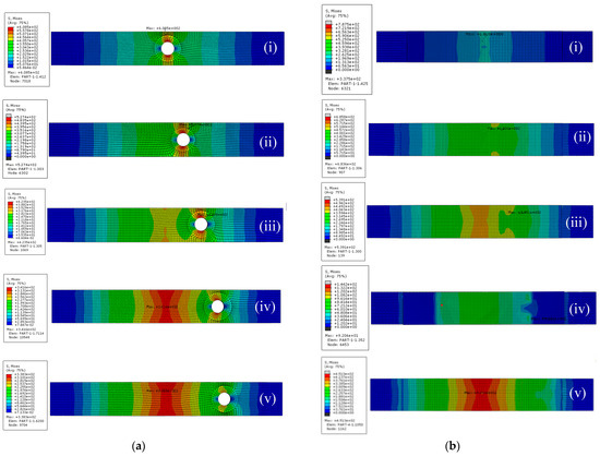 Contours of stress variation with offset distance for (a) non-strengthened, (b) CSH/CFRP hybrid system: (i) zero, (ii) 20 mm, (iii) 40 mm, (iv) 60 mm, and (v) 80 mm.