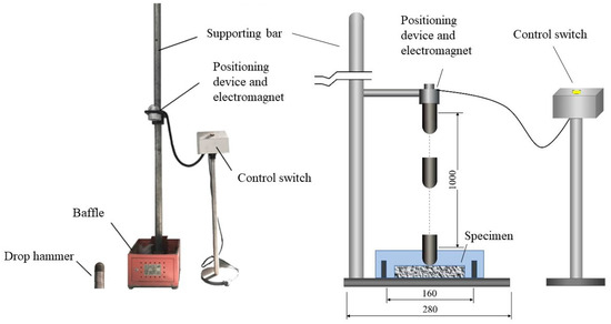 With the global urbanization trend, the burgeoning construction industry has escalated the demand for concrete materials, particularly natural aggregates (NAs) that serve as key components in concrete production. At the same time, the demolition of buildings generates a large amount of construction solid waste, primarily comprised of waste concrete. Traditional disposal methods, such as conventional landfills, not only consume extensive land resources but also result in soil quality degradation, rendering the management of construction solid waste a pressing concern. Recently, guided by the principles of resource recycling, waste concrete blocks undergo a series of processes, including crushing, cleaning, and screening, to obtain recycled aggregate (RA). The RA is subsequently blended in specific proportions and grades, partially or entirely replacing NA to create recycled aggregate concrete (RAC). On the one hand, the use of recycled resources reduces the demand for natural aggregates and reduces the exploitation of natural resources. On the other hand, it realizes the reduction, harmlessness, resourcefulness and industrialization of construction solid waste. In addition, research by related scholars shows that incorporating RA in concrete production significantly reduces carbon dioxide emissions during the manufacturing process, which brings considerable economic and environmental benefits [1,2]. However, the high water absorbance and pressure crushing index of RA, and the more microcracks on the surface of RA, result in the mechanical properties of RAC generally being lower than those of natural aggregate concrete (NAC), which restricts the promotion and application of RAC [3]. In particular, the recycled concrete structures applied in road engineering, bridge engineering, etc., will not only bear static loads but also may be subject to the impact of water flow, explosions, vehicle impact and other sudden and destructive dynamic loads and seismic waves. A study by Lu et al. [4], utilizing split Hopkinson pressure bar tests, revealed that, in comparison to NAC, RAC exhibited a lower dynamic increase factor and reduced energy absorption capacity. Additionally, Rao et al. [5] have observed that when the RA substitution rate surpasses 25%, the responses of RAC under a given drop weight impact load deteriorate while strain levels increase. Therefore, it is of vital significance to carry out research on the damage morphology, mechanical properties and impact life of RAC under impact loading to enhance the safety of RAC structures, as well as to provide an experimental basis for the popularization and application of RAC.