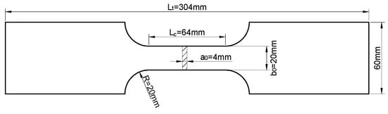 The test specimens were designed and produced according to the EN10002-5-1992 [] and GB/T 228.1-2010 standards []. The original cross-sectional area of the parallel length, , was taken as 4 mm, and the original width, , of the parallel length of the plate specimen was taken as 20 mm. According to the specifications, the transition arc, , of plates with a thickness greater than or equal to 3 mm should be more than 12 mm, and 20 mm was taken for the specimens in this study. The head width should be more than 1.2 , and in this experiment, the head width was taken as 60 mm.