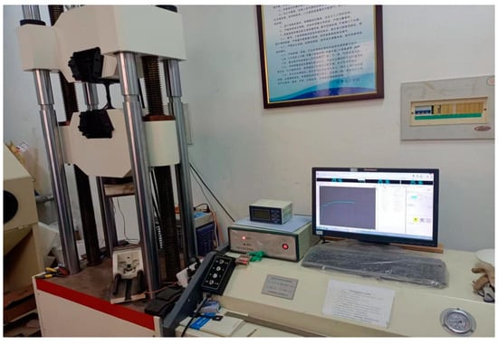 Upon loading startup, the test machine was warmed up. The cross-sectional area of the test piece was measured at the parallel length. Gause was pasted onto the test piece. Then, the testing machine was set up, and zeroing of the machine was completed. In addition, the gripping of the test piece was restricted to the grip section. The speed of testing was defined in terms of that is the rate of the testing machine, and that is the straining rate of the parallel length of the test piece. The loading history was recorded by a computer, as shown in Figure 2. The rate of the machine, , was calculated by Equation (3).