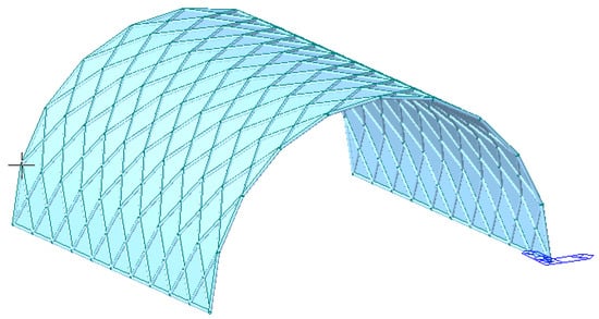 A single-layer cylindrical reticulated shell was selected as the analysis model, as shown in Figure 3. The span and longitudinal length of the prototype structure were both 20 m, the shell height was taken as 10 m and the number of vertical and horizontal grid divisions was 10. The material was structural steel, and the cross-section was a uniform 180 mm × 10 mm circular steel pipe. The dynamic scale model was made of 304 stainless steel, and all the other dimensions were scaled to a length similarity of 1:20. The specific data are shown in Table 7.