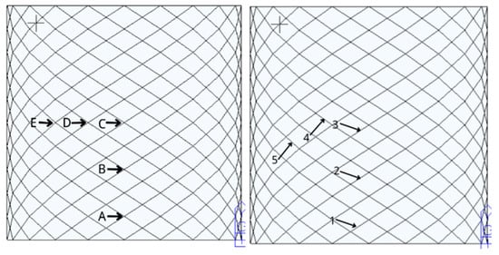 Five nodes and five elements on the prototype structure and the scale model were taken as the observation nodes and elements, respectively. The nodes and elements are shown in Figure 4. By comparing the displacement, internal force, etc., of these nodes and elements, the feasibility of the similarity relationship of the scale model can be demonstrated. In Figure 4, A–E means the node number, and 1–5 means the element number.