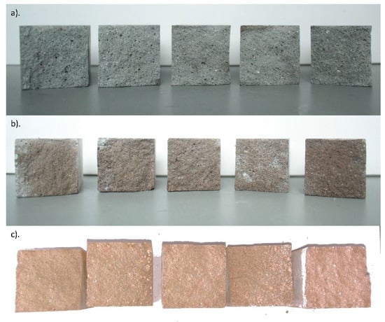 The maximum amount of EP was established on the basis of mortar consistency in such a way as to not exceed the maximum dose of SPF to obtain a radius of 14 ± 1 cm in the flow table consistency test for OPC mortars. For the sake of simplicity, the perlite:sand ratio is a volume ratio. The exact composition of the mortars is presented in Table 5. Cross sections of the samples containing different cements and amounts of EP are given in Figure 1. Samples prepared with other cements differed only in colour. The EP was hardly visible due to its fineness.