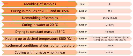 Samples of hardened mortars with dimensions 160 × 40 × 40 mm3 for compressive strength, density, and absorbability tests were prepared, cured, and tested according to standard EN 196-1 [67]. Mortars were stored in a 20 °C water bath for 28 days, then removed and dried to a constant mass at 65 °C to avoid the dehydration of gypsum. After being dried, the samples were placed in an electric furnace. The samples were separated by chamotte dividers to avoid merging. The samples were heated to 300 °C, 650 °C, and 1000 °C at a rate of 300 °C/h. The isothermal conditions at the selected temperatures were maintained for an hour. The cooling rate was non-linear, and the samples were cooled with a furnace. The preparation and heating procedure is illustrated in Figure 3.