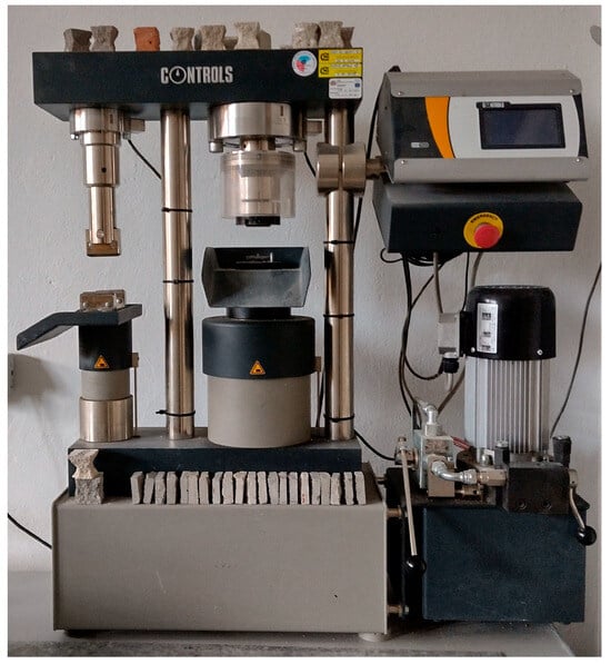 After cooling, the dimensions of the samples were measured. All samples were weighed, photographed, and their compressive strength was tested (six samples of each type). Confidence intervals are presented in the diagrams. The compressive strength was tested according to EN 196-1 [67]. The setup of the compressive strength test is presented in Figure 4. The dry density was tested according to EN 1015-10 [69] for samples that reached constant mass after drying at 65 °C (for samples before heating) and after cooling to room temperature for samples after heating. Absorbability was tested according to EN 13755 [70] (only for samples before heating). This parameter was tested on three samples of each type. Confidence intervals are presented in the diagrams. The samples were photographed after heating to 650 °C and 1000 °C before the strength test to show the thermal cracks visible on the surface. There were no changes visible to the naked eye after heating to 300 °C.