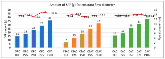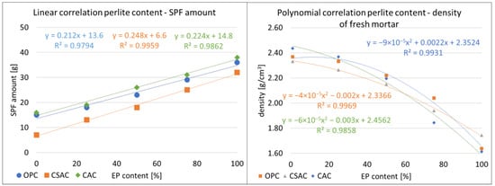 Immediately after mixing, the consistency was tested. Figure 5 indicates that the amount of SPF needed to obtain a flow diameter of 14 ± 1 cm was almost exactly the same for the OPC and CAC mortars. The amount of SPF needed increased from 15 and 16 g for mortars with sand as aggregate for OPC and CAC cements, respectively. The dose increased with EP content up to 36 and 38 g for mortars with 100% perlite for OPC and CAC cements, respectively. For CSAC, it was lower, disregarding the amount of EP added. The decrease was in the range of 12% for 100% perlite content, up to 50% for mortars that contained only sand. This shows that the main factor shaping consistency is the perlite content. Such behaviour of the CSAC, CAC, and OPC-based cements used in this research related to consistency, viscosity, and rheology, as observed in the current study is dependent on the exact type, specific surface area and composition of both cements. This means that taking different OPC, CSAC, and CAC, varying in phase composition or specific surface area, the results of consistency may be different [71]. This is connected to the very fast setting of CSAC, and difficulties in proper conducting of tests. There is research showing better consistency of concrete-based concrete and the opposite is also reported [72,73,74]. CAC rapidly loses workability over time [75]. In addition, no results of CSAC-SF or blends have been reported. CAC-SF may be of improved consistency [76].