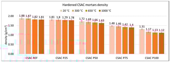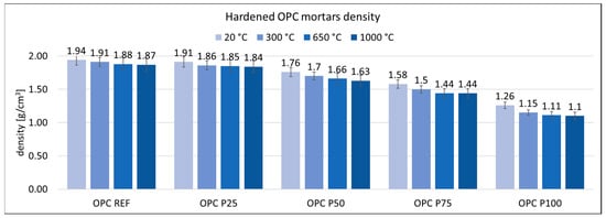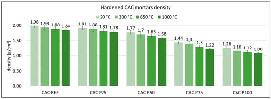 The dry density of mortars containing lightweight aggregate is obviously lower, and the decrease is proportional to the EP content. The results are given in Figure 7, Figure 8 and Figure 9 for OPC, CSAC, and CAC, respectively. The drop in density for OPC-based mortars with sand replacement level at 0, 25, 50, 75 and 100% by EP is 1.94, 1.91, 1.76, 1.58 and 1.26 kg/m3 which is 1.5, 9.3, 18.6, 35.1%, respectively (percentage difference to non-perlite mortar). This drop is the result of replacement of the sand with EP that is of lower density. This is only an example; other mortars based on various cements exhibit a similar behaviour. The full list of percentage differences is presented in tabular form in Table 6. The comparison of results is referred to the mortar density at 20 °C, for various cements separately. There are slight exceptions, but the rule is that the density decreases together with perlite content, but also with temperature to which mortars were subjected. This is obvious because of the loss of chemically bound water and thermal decomposition of hydrates in various cement pastes. It was thoroughly described in the Introduction, together with the temperature choice (i.e., [39,55,56,62]). The differences are visible when comparing various cements, but are not very significant. It is connected with shrinking of samples subjected to heating, which means that, together with mass loss, volume loss is present.