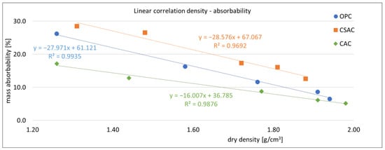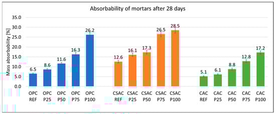 The absorbability of mortars is strictly related to their density. The results are presented in Figure 10. Obviously, increasing the perlite content produces an increased absorbability due to the higher porosity of the composites. However, although the density of mortars containing various cements is similar at 20 °C, the relations of absorbability are different. The OPC-based mortar has an absorbability raising from 6.5% for no perlite content to 26.2% for 100% perlite-based sand replacement. The largest increase in the amount of absorbed water is between 75 and 100% EP content. CSAC has greater initial absorbability at a level of 12.6% and reaches 28.5% for 100% EP, but the greatest increase is observed between 50 and 75%. Moreover, CAC mortars behave similarly to those with OPC but with a greater substitution of sand for perlite. The initial absorbability is 5.1%, 6.1% is for 25% EP—a value similar to OPC without EP at all. CAC mortar with 100% perlite instead of sand exhibits almost the same absorbability. Similar relations are for intermediate replacement levels. Since the density of CAC and OPC mortars is almost the same, the reason has to be the open/close porosity ratio. The former must be greater for OPC based composites. Lower permeability was reported for CAC, which may support the present results [78]. There are no other works found dealing with CAC or CSAC lightweight mortars that can confirm this further.