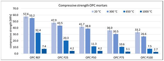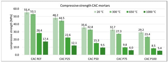 The general behaviour of mortars is predictable: a higher perlite content produces a lower compressive strength, and the higher temperature at which the samples were heated has the same effect. The interesting part of it is the similarity of the OPC and CAC strength up to 650 °C. After heating to 300 °C, the strength is 55.2 MPa and 53.1 MPa for samples without perlite and 26.6 MPa and 23.4 MPa for 100% perlite content. Heating the samples without perlite up to 650 °C resulted in a strength of 32.4 MPa and 28.4 MPa, while for samples with a 100% EP content it is 7.5 MPa and 8.5 MPa. Both OPC and CAC lose most of the strength between 300 °C and 650 °C. The difference is visible after heating at 1000 °C For OPC-based mortar, the residue strength is 7.4 MPa for the sample without perlite and 2.7 MPa for the sample with 100% substitution of sand by perlite. CAC the residue strength is higher and the values are 17.4 MPa and 5.4 MPa, respectively. It is due to the high heat resistance and refractory properties of CAC composites [47]. Such properties are mainly caused by CA as the main phase of CAC. It should be mentioned that CAC above 1000 °C is sintered and its strength increases [46].