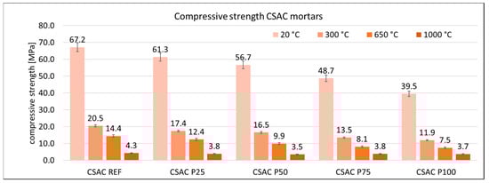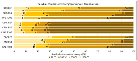 For clarity of presentation, the percentage of residual strength is presented in Figure 14. It is important to note that the general residual strength is higher for samples with a lower amount of perlite. The smallest differences are present in the case of CSAC (6–9% at 1000 °C, 17–21% at 650 °C and 28–30% at 300 °C). The strength of the cement-aggregate composite is a function of the strength of the cement matrix, the strength of the aggregate and the bond between these phases [82]. In case of heating in the studied range, the sand and perlite generally remain unchanged [26,83]. Changes are present in the cement matrix. Its strength decreases due to the thermal decomposition of hydration products [55,56,62]. The strength decreases to a specific level that may be above or below of the aggregate strength level. If there is more sand and less perlite than the composite, it is of greater strength because the sand strength is greater than that of the perlite. Therefore, if the strength of the cement matrix and its bond to the aggregate is satisfactory, the composites with a higher amount of sand will perform better.