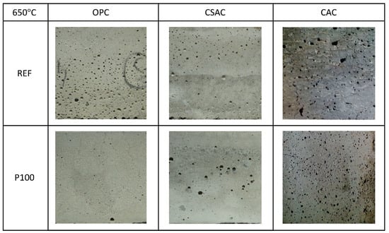 The similarity of the behaviour of OPC and CAC is visible for all perlite contents at temperatures up to 300 °C (80–96% for both cements) and up to 650 °C (23–56% for OPC and 29–51% for CAC). The CSAC behaviour is very different.