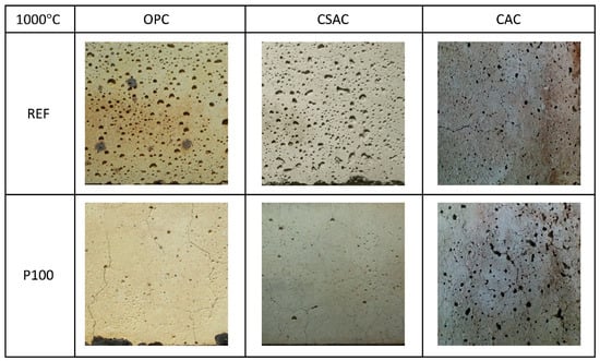 The greatest residual strength (18–31%) is present at 1000 °C in the case of CAC. For OPC and CSAC, it is 8 to 13% and 6% to 9%, respectively. The perlite content has little influence on the percentage of residual CSAC strength at different temperatures and even slightly increases with the increase in the perlite content at 1000 °C. The loss of strength for CSA cement itself is so huge that the cement matrix plays a small role in shaping the strength. Its deterioration is so significant that it cannot longer hold the aggregate together and destruction is through the cement matrix and not through the perlite particles. The residual strength is presented as a percentage, and in absolute terms it is in the range of 3.7 to 4.3 MPa, so the difference is very small.