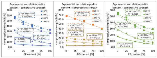 Figure 11, Figure 12 and Figure 13 show the results of the compressive strength tests for OPC, CSAC, and CAC mortars, respectively. Sand perlite replacement was found to not improve concrete performance at elevated temperatures. Samples of mortars manufactured using CSAC, which were not subjected to elevated temperatures, have the highest compressive strength (67.2 MPa–39.5 MPa for 0% and 100% EP content, respectively) compared to those based on OPC and CAC. Both latter are comparable reaching, respectively: 57.6 MPa and 55.4 MPa for samples without perlite and 33.2 MPa and 29.2 MPa for 100% of perlite content.