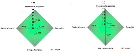 As shown in Figure 3a, the preference order of subcriteria under the technical properties criterion for selecting materials for structures was watertightness, mechanical properties, fire performance, and durability. The priority order of envelope materials for subcriteria under technical properties criteria is as follows: watertightness, fire performance, durability, and mechanical properties (Figure 3b).