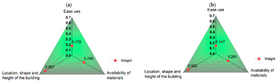 The priority order of subcriteria under the condition and logistics criterion for selecting materials for structures and envelopes is as follows: location, shape, and height of the building; availability of materials; ease of use (Figure 4). The most critical subcriterion in this criterion is the building’s location, shape, and height, with a weight of 0.567 for structural materials (Figure 4a) and 0.592 for envelopes materials (Figure 4b).