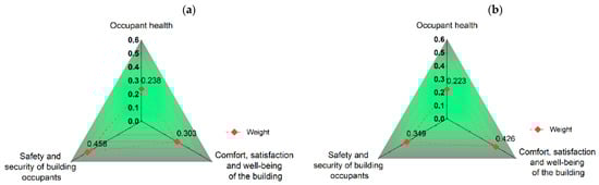 Figure 5 shows the ranking of subcriteria under the social benefits criterion for selecting materials. The priority order of subcriteria for this criterion for structures is as follows: safety and security of the building’s occupants, comfort satisfaction of the building, and occupation health. The results showed that the criterion of safety and security of the building’s occupants was prioritized first, weighing 0.458 (Figure 5a).