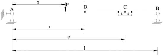 Damage information of a bridge structure is analyzed by the difference in quasi-static displacement influence lines, denoted as Δω(x), before and after damage at an arbitrary section D of a simply supported beam. The expression for the function of Δω(x) with respect to the distance from the moving load to point A can be derived as follows: