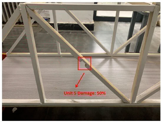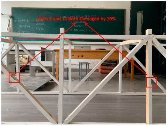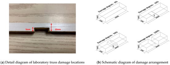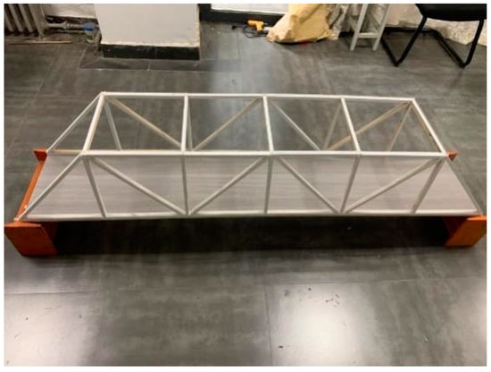 2. The members are bonded using hot-melt adhesive. The experimental test beam has a total length of 1.8 m, with an effective test segment of 1.6 m. There are 0.1 m of bridge deck on each side as a buffer zone for accelerating and decelerating moving loads. The bridge deck is constructed from a single piece of Japanese white pine, measuring 1.8 m in length, 0.4 m in width, and 0.005 m in thickness. The boundary conditions on both ends are mobile supports. By changing the cross-sectional shape of the truss beam at the damage location, the degree of damage is quantified. The bridge test model is shown in