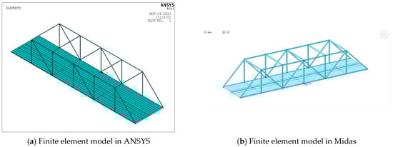 To validate the applicability of the bridge test model, a combined methodology involving experiments and numerical analysis was employed to comprehensively assess its static and dynamic characteristics. Distinct finite element models for the bridge structure were meticulously formulated using ANSYS and Midas software. In the ANSYS model, the upper and lower chord members, as well as the diagonal bracing elements, were discretized using Link8 elements, while the bridge deck was simulated using Shell181 elements. The comprehensive 3D finite element model of the bridge in ANSYS comprises a total of 470 elements and 375 nodes, as visually represented in