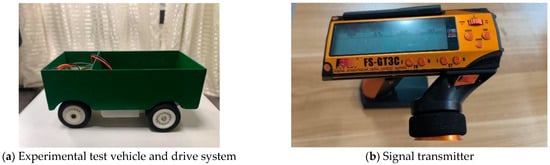 The experimental vehicle is comprised of a metal body equipped with an FS-GR3E drive system. The dimensions of the vehicle’s body measure 0.2 m × 0.09 m × 0.05 m, with a total weight of 10 N. The rear cargo compartment of the vehicle is designed with dimensions of 7.5 cm × 3.5 cm × 3.5 cm, allowing for the placement of a specific number of counterweights to adapt to varying cargo loads. It is equipped with the FS-GT3C remote control system, which operates on a 3-channel 2.4 G transmission signal, providing controlled speed within a designated range. The visual representation of both the vehicle and the accompanying remote control system is provided in