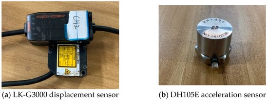 To assess the behavior of the bridge, both a static load test and a dynamic resonance test were conducted. In the static load test, a 3 kg test weight was positioned at the mid-span of the bridge, and the deflection at this location was quantified using a laser displacement sensor (model LK-G3000, KEYENCE, Osaka, Japan). The dynamic resonance test aimed to determine the bridge’s fundamental frequency, and it employed a single-point excitation technique. The bridge underwent free vibration excitation by being struck with a rubber hammer. Vibration signals were then collected via piezoelectric accelerometers (model DH105E, Jiangsu Donghua Testing, Taizhou, China) positioned at critical locations, including the bridge’s supports, 1/4 span, mid-span along the central axis, and at the deck’s edge.